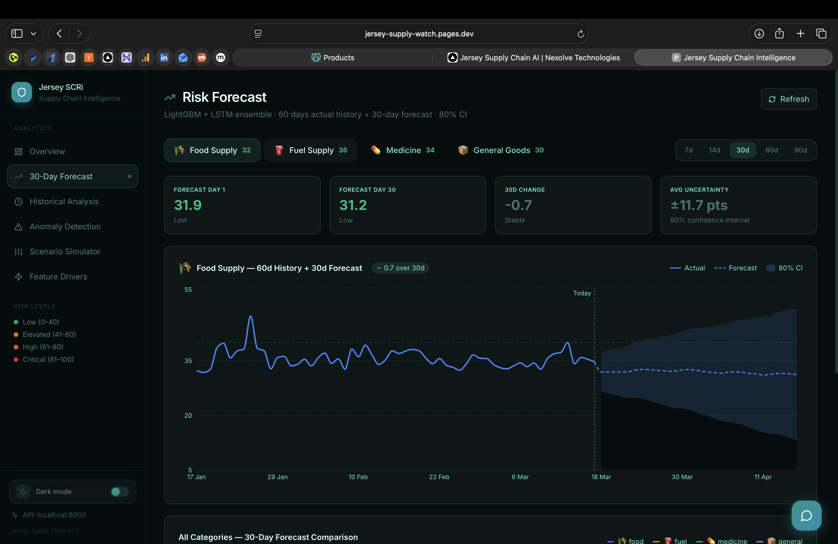 Jersey Supply Chain AI (Jersey SCRi) is a decision-support dashboard built for Jersey Island's supply chain governance, a small island economy with acute exposure to food, fuel, medicine, and general goods import disruption. The Next.js TypeScript frontend is styled with Shadcn UI and Tailwind CSS, served via Cloudflare; a FastAPI Python backend exposes the inference API backed by PKL-serialised trained models hosted on HuggingFace. A three-model ensemble (LSTM for temporal patterns, XGBoost for feature importance, anomaly isolation forest for outlier detection) trained on 9,573 rows of supply chain history surfaces a live composite risk score with 7-, 14-, and 30-day forecast horizons.