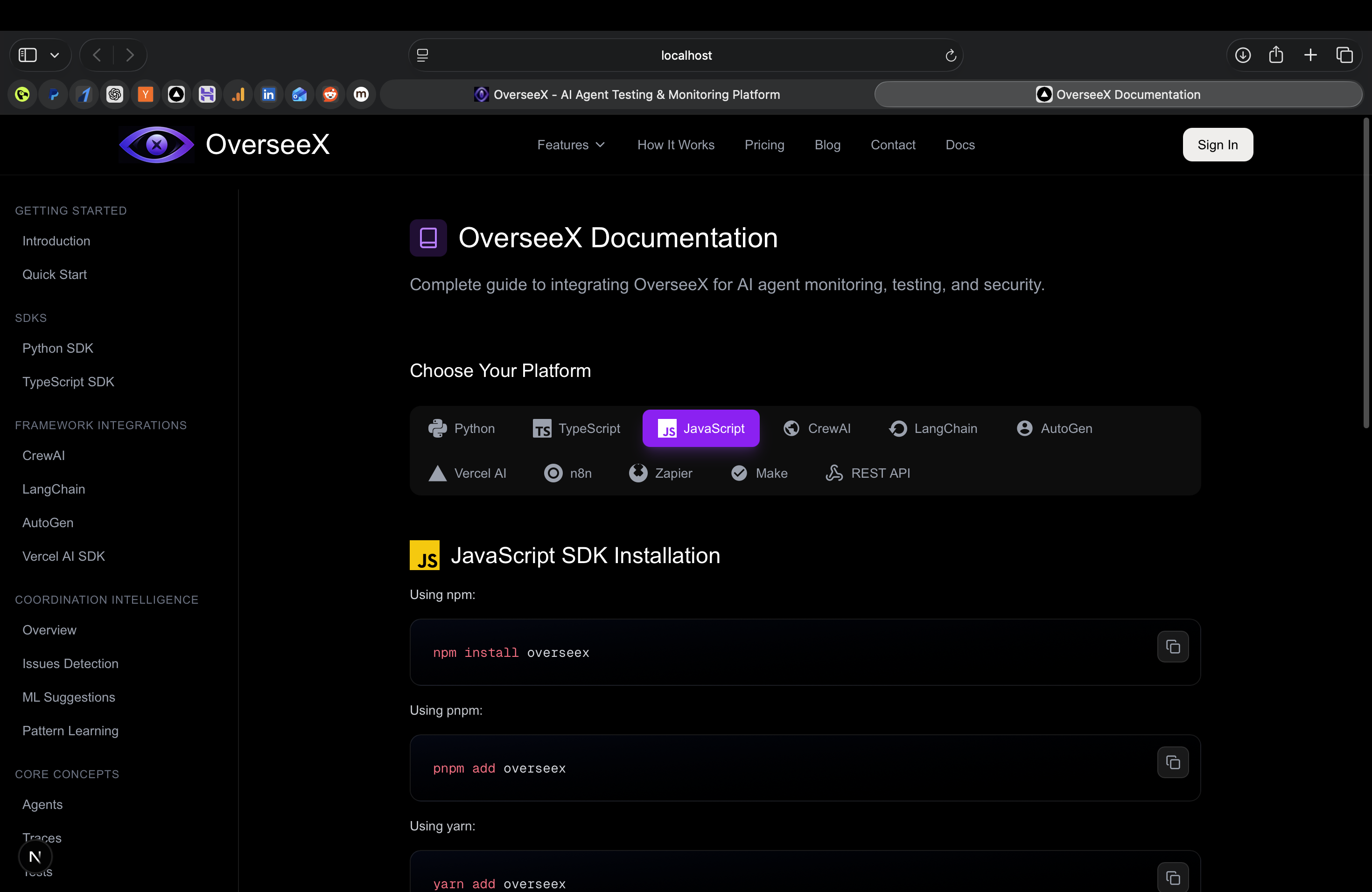 Developers instrument their AI agents by installing the `@overseex/sdk` npm package or the `overseex` PyPI package with a single `npm install overseex` / `pip install overseex` command; the SDK intercepts LLM calls, tool invocations, and agent handoffs, streaming structured trace events to the FastAPI ingest endpoint via webhook.